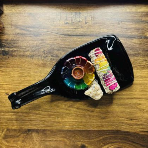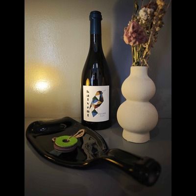 Подаръчен пакет включващ: Бутилка Kalvent Syrah 2024, плато от стопена бутилка и кожени етикети за винена чаша. Изненадай любим човек за празника.